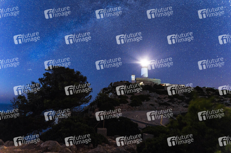 Die Milchstraße über dem Cap Formentor. Das Milchstraßensystem besteht aus etwa 100 bis 300 Milliarden Sternen und großen Mengen interstellarer und Dunkler Materie. Mallorca, 20.07.2020