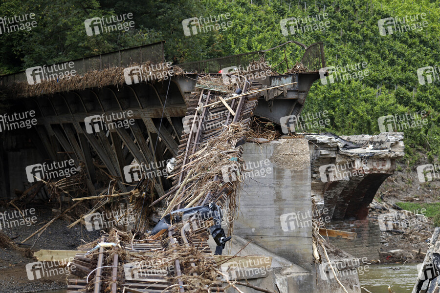 Nach dem Jahrhunderthochwasser in der Eifel durch heftige Regenfälle und Dauerregen mit Überschwemmungen und Überflutungen haben die Aufräumarbeiten im Ahrtal große Fortschritte gemacht. Einheiten von Polizei, THW, Bundeswehr und Feuerwehr mitsamt vielen freiwilligen Helfern haben Straßen geräumt, Schutt und Schlamm entfernt und die Menschen versorgt. Der Wiederaufbau wird trotzdem Jahre dauern. Im Bild Flutschäden an einer Brücke zwischen Rech und Mayschoß, die durch die Flut beschädigt wurde, 08.08.2021