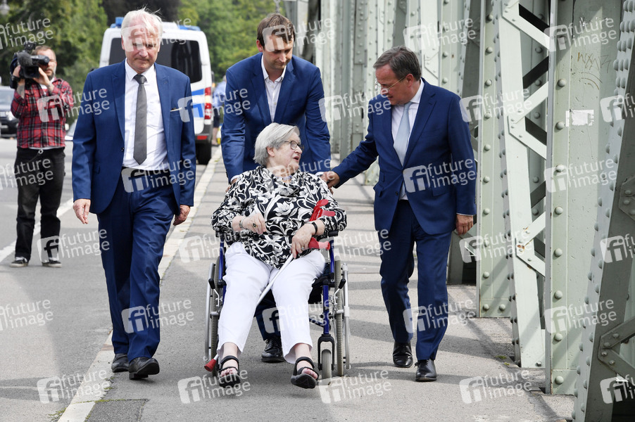 Dieter Dombrowski, Maria von Pawelsz-Wolf und Armin Laschet bei einer Gedenkveranstaltung zum 60. Jahrestag des Baus der Berliner Mauer an der Glienicker Brücke. Potsdam, 13.08.2021