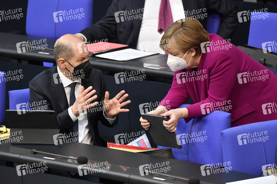 Olaf Scholz und Angela Merkel in der 218. Sitzung des Deutschen Bundestages im Reichstagsgebäude. Berlin, 25.03.2021