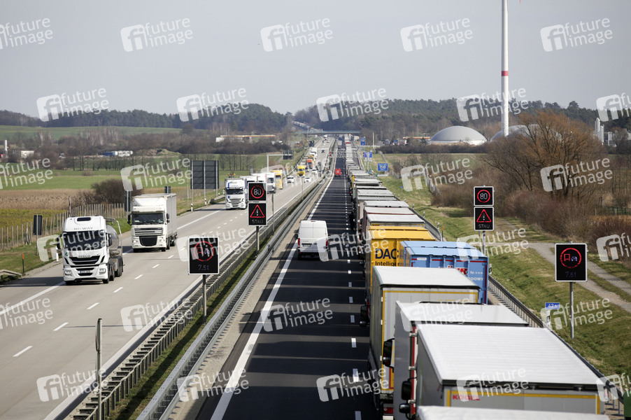 LKWs stehen auf der A12 in Fahrtrichtung Polen im Stau. Die Grenzen zwischen Polen und Deutschland sind wegen des Coronavirus geschlossen. Frankfurt (Oder), 16.03.2020