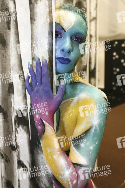 Bodypainting und Fotoshooting mit Model Sarah am Tag der offenen Tür der Meisterschule Justus-von-Liebig-Schule, Abteilung Floristik in Hannover-Ahlem. Künstler: Jörg Düsterwald