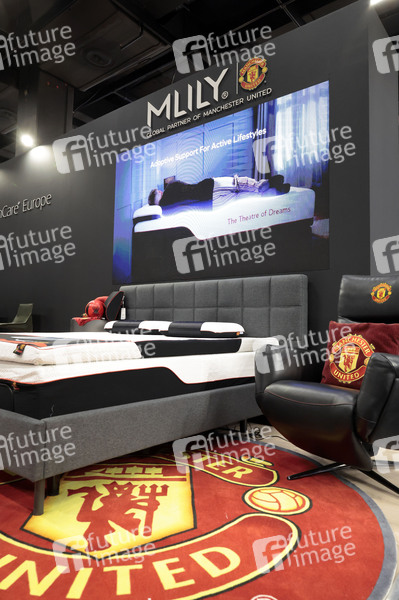 Doppelbett mit Logos 'United' beim Presserundgang zur Eröffnung der imm cologne - World of Interiors, der Fachmesse für Möbel und Innenraumgestaltung, in der Koelnmesse, Köln, 20.01.2026