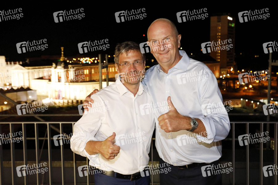 Mike Schubert und Dietmar Woidke bei der Wahlparty der SPD nach der Landtagswahl in Brandenburg im Bildungsforum Potsdam. Potsdam, 01.09.2019