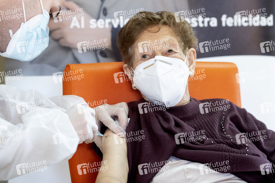Impfung der Bewohner und des Pflegepersonals gegen das COVID-19 Virus mit dem Impfstoff von Biontech und Pfizer in der Altenresidenz Dominus VI. Alcala de Henares, 04.01.2021
