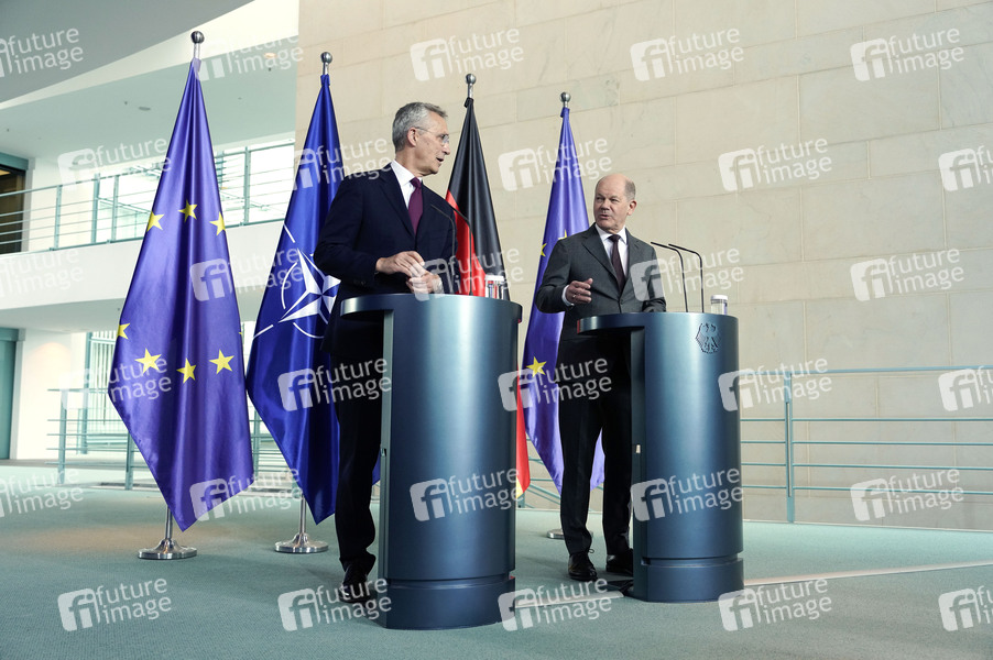 Jens Stoltenberg und Olaf Scholz beim Empfang des NATO-Generalsekretärs zu einem gemeinsamen Gespräch mit dem Bundeskanzler mit anschließendem Pressestatement im Bundeskanzleramt. Berlin, 26.04.2024