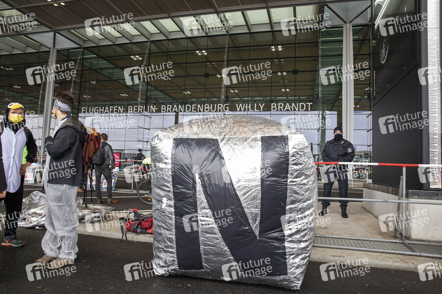 Protestaktionen von Mitgliedern des Bündnisses 'Am Boden bleiben' bei der Eröffnung des Flughafens Berlin-Brandenburg (BER). Schönefeld, 31.10.2020