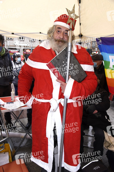 Weihnachtsmann bei der Kundgebung gegen die geplante Steigerung der Rüstungsausgaben unter dem Motto 'Abrüsten statt Aufrüsten' im Rahmen des bundesweiten Aktionstages gegen Aufrüstung und Krieg am Marienplatz. München, 05.12.2020