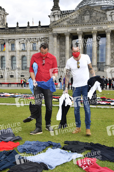 Sascha Vollmer und Alec Völkel von The BossHoss legen ihr letztes Hemd vor dem Reichstagsgebäude ab - Unter dem Motto #AlarmstufeRot protestieren Mitarbeiter der Kultur-und Veranstaltungsbranche in Berlin für Soforthilfen für die Veranstaltungswirtschaft. Durch die Schließungen und Absage von Veranstaltungen während der Corona-Pandemie stehen viele Kulturschaffende, Veranstalter, Messe- oder Bühnenbauer, Techniker und Kunstschaffende vor dem Aus. Berlin, 09.09.2020