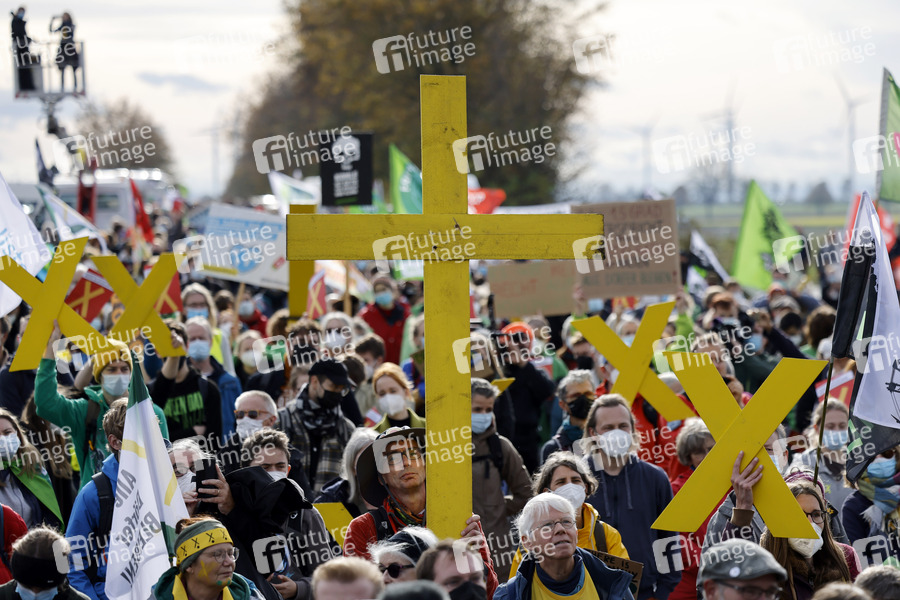 Kohlegegner wie Mitglieder von Greenpeace, Fridays for Future und linksradikalen Gruppen wie der Antifa haben in Lützerath gegen den Tagebau protestiert. Das kleine Dorf an der Kante von Garzweiler soll dem Braunkohleabbau weichen. Allerdings will der Energiekonzern RWE vorerst auf den Abriss verzichten. Im Bild Teilnehmer der Demo gegen den Abriss. Lützerath, 31.10.2021