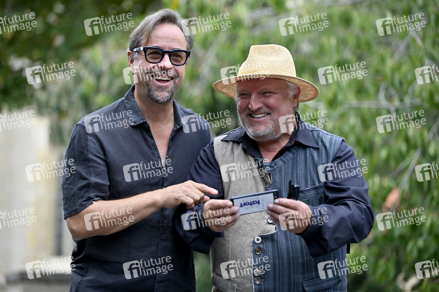 Jan Josef Liefers und Axel Prahl beim Presserundgang 'Spurensuche Tatort Münster' an original Drehorten mit dem Tatort-Cast zum 20 jährigen Jubiläum des Münsteraner Tatorts. Münster, 30.08.2022