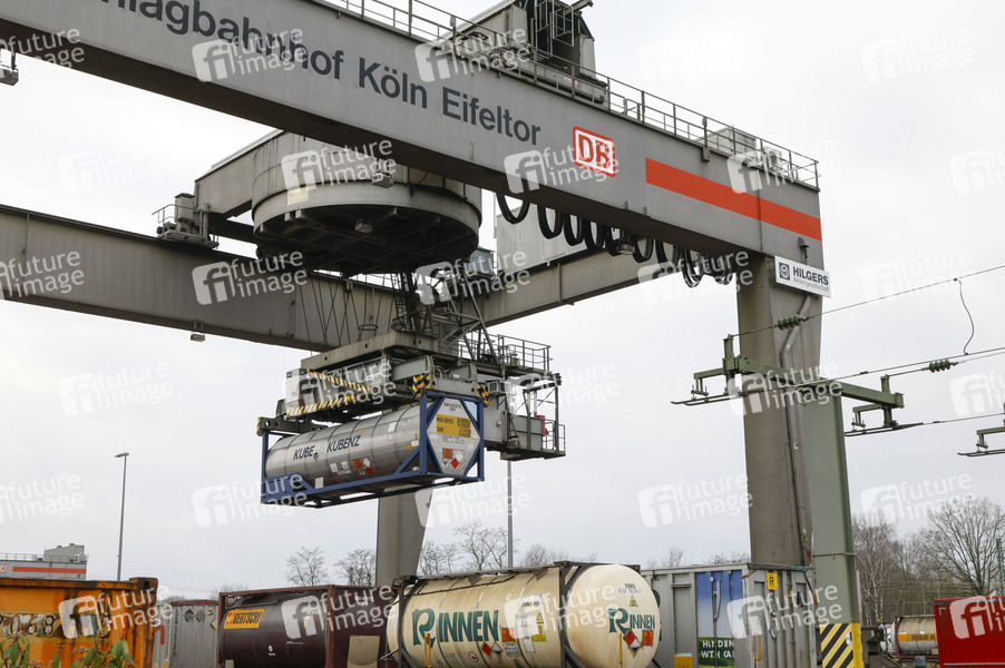 Container-Verladung beim Fototermin 'DB montiert 400 Tonnen schwere neue Krananlage' im DUSS-Terminal Köln-Eifeltor. Köln, 23.01.2025