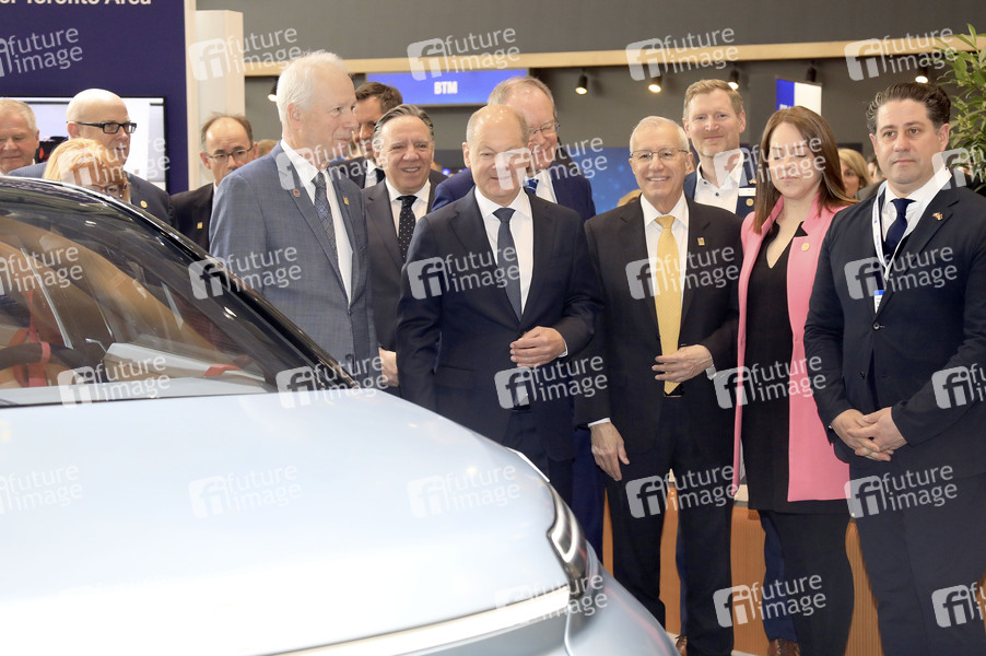 Stephane Dion, Olaf Scholz und Stephan Weil neben einem Elektroauto von Project Arrow beim Eröffnungsrundgang auf der Hannover Messe 2025 auf dem Messegelände. Hannover, 31.03.2025