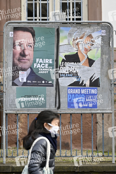 Wahlplakate mit Yannick Jadot (Europe Écologie-Les Verts) und Valerie Pécresse (Les Républicains) - Die Präsidentschaftswahl in Frankreich 2022 ist die zwölfte Wahl des Staatspräsidenten der Fünften Französischen Republik. Der erste Wahlgang findet nach Ablauf der laufenden fünfjährigen Amtszeit am 10. April 2022 statt. Sollte kein Kandidat im ersten Wahlgang die absolute Mehrheit er Stimmen erhalten, ist am 24. April ein zweiter Wahlgang vorgesehen. Straßburg, 05.04.2022