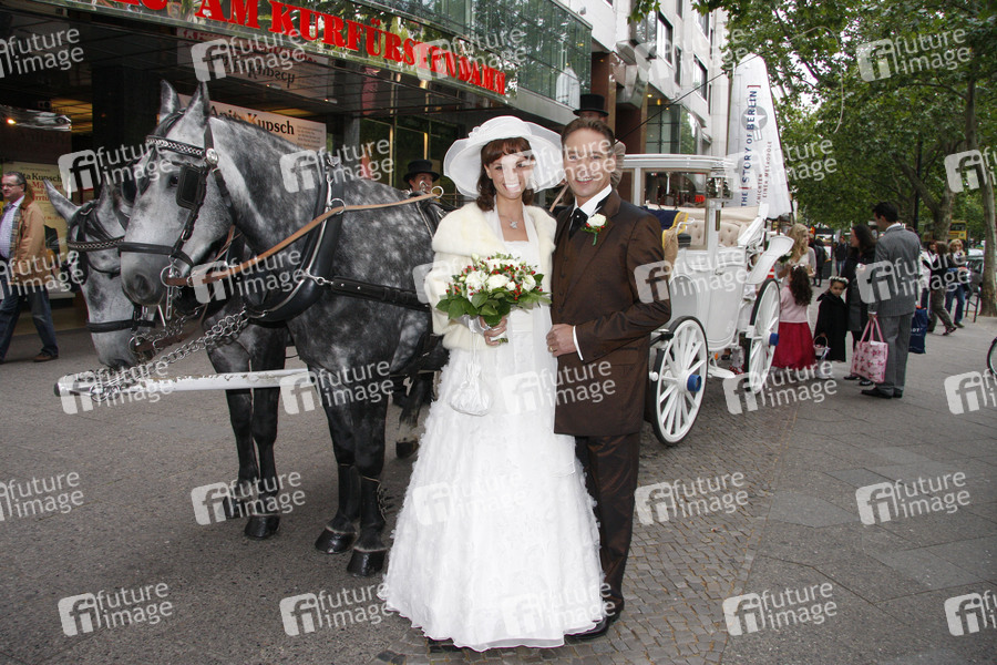 Das Brautpaar Jacques Breuer und Viola Wedekind mit der Hochzeitskutsche unterwegs vom Theater am Kurfürstendamm zur Hochzeitsfeier im Hotel Seehof