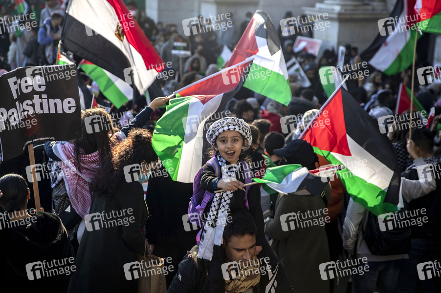 Tausende Menschen bei einem Protestmarsch, organisiert von pro-palästinensischen Organisationen. Viele Teilnehmer trugen Palästina-Fahnen und 'Free Palestine'-Banner. Ein Sprecher der Gruppe forderte die britische Regierung auf, ihre militärische, diplomatische und finanzielle Unterstützung für Israel umgehend einzustellen. London, 21.03.2021