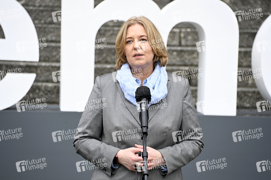Bärbel Bas bei den Pressestatements von Wolfgang Sobotka, Mickey Levy und Bärbel Bas am Schriftzug #WeRemember zur Erinnerung an die Millionen im Nationalsozialismus ermordeten Juden vor dem Reichstagsgebäude. Berlin, 25.01.2022