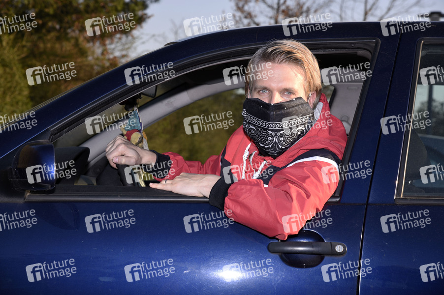 Robin Bade mit selbstgebastelten Mundschutz bei einem exklusiven Photoshooting im Riemer Park. München, 02.04.2020