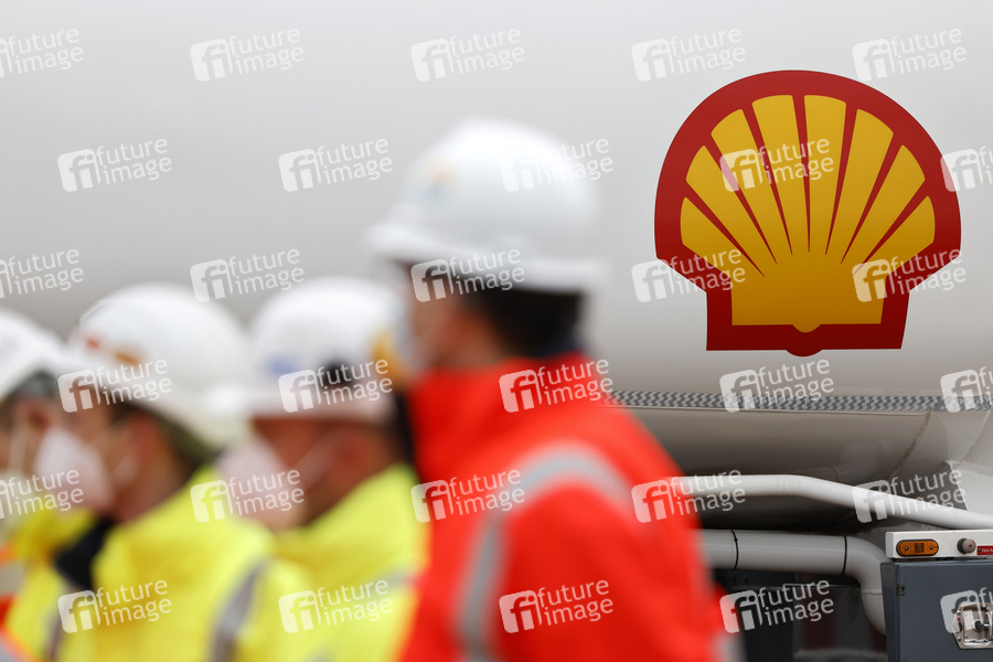 Shell-Logo auf einem Tankwagen bei der Eröffnung der Baustelle für Deutschlands größte Anlage zur Herstellung von Bio-Flüssiggas auf dem Gelände des 'Shell Energy an Chemicals Park Rheinland'. Köln, 09.02.2022