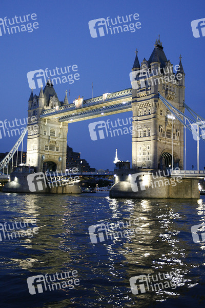 Klappbrücke, Neugotik, 244 Meter lang, Höhe der Brückentürme 65 Meter, die Fahrbahn zwischen den 61 Meter voneinander entfernten Türmen liegt neun Meter über dem Fluss, Fußgängerbrücke in 43 Meter Höhe, die beiden Baskülen können bis zu einem Winkel von 83 Grad hochgeklappt werden, Architekt Horace Jones, erbaut 1886 bis 1894, Themse, Nachtaufnahme