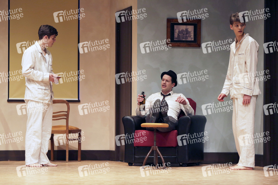 Lucas Reiber, Urs Fabian Winiger und Sandro Lohmann bei der Fotoprobe 'Eine ganz normale Familie' im Theater am Kurfuerstendamm. Berlin, 06.03.2013