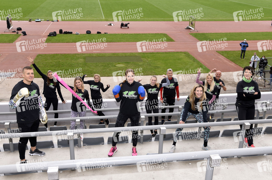 Alem Begic, Christina Hering, Karolin Kandler, Anna Kraft, Marie Lang, Katharina Trost, Klaus Augenthaler, Viola Weiss, Tina Kaiser, Stefan Lehmann und Janina Hartwig beim Fototermin zur sportichen '#WocheChallenge' im Olympiastation München. Unter dem Motto 'Wir können was bewegen!' ruft die Welthungerhilfe zu dieser Challenge auf und bittet um Spenden für eine Welt ohne Hunger. München, 13.10.2020