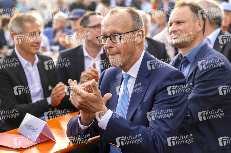 Friedrich Merz bei einer Wahlkampfveranstaltung der CDU zur Landtagswahl in Thüringen im Autohaus Peter. Erfurt, 21.08.2024
