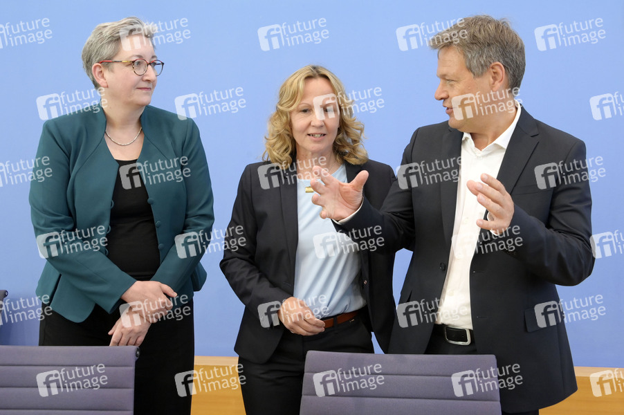 Klara Geywitz, Steffi Lemke und Robert Habeck bei der Bundespressekonferenz zu den Gesetzesentwürfen aus dem heutigen Kabinett zu Wind-an-Land und Bundesnaturschutzgesetz im Haus der Bundespressekonferenz. Berlin, 15.06.2022