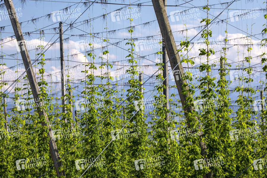 Hopfenstauden am Hopfenpfad beim Fototermin am Hopfengut No20. Tettnang, 07.07.2020