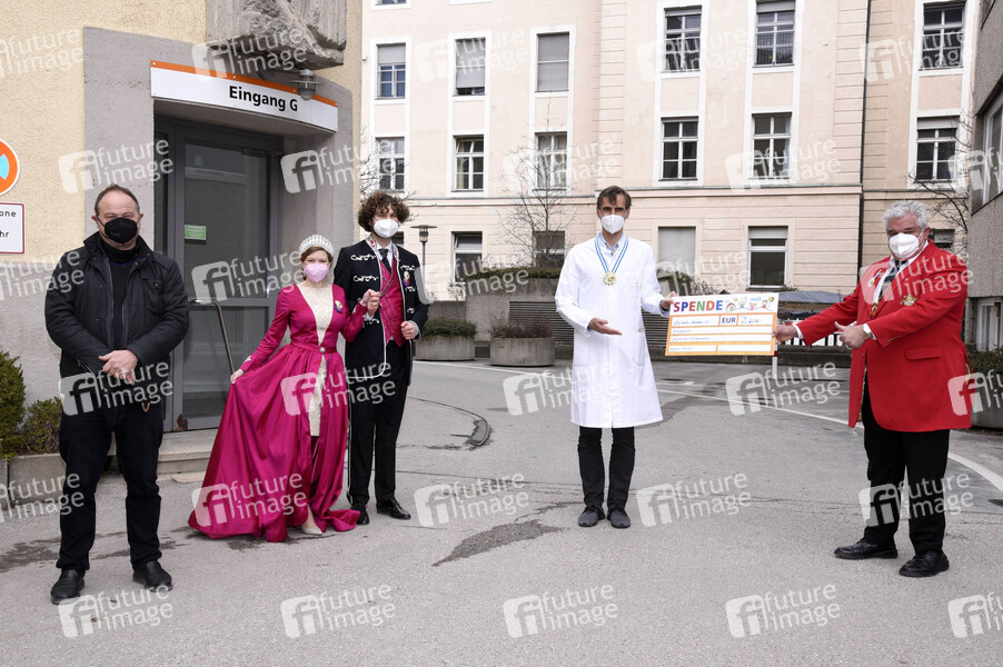 Rainer Maria Schießler, Margarethe Stadlbauer (Margarethe I.), Berni Filser (Berni I.), Prof. Dr. med. Tobias Feuchtinger und Narrhalla Präsident Günther Grauer bei der Spendenscheckübergabe von Narrhalla an das Dr. von Haunersche Kinderspital. München, 18.03.2021