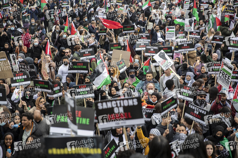 Tausende Menschen bei einem Protestmarsch, organisiert von pro-palästinensischen Organisationen. Viele Teilnehmer trugen Palästina-Fahnen und 'Free Palestine'-Banner. Ein Sprecher der Gruppe forderte die britische Regierung auf, ihre militärische, diplomatische und finanzielle Unterstützung für Israel umgehend einzustellen. London, 21.03.2021