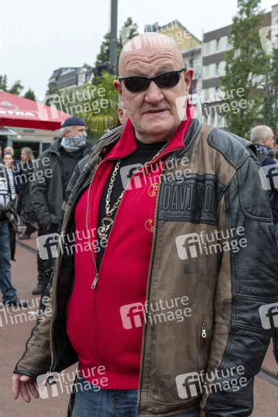 Eddy Kante bei einer Motorrad-Demo auf der Reeperbahn. Tausende Motorradfahrerinnen und -fahrer haben am Sonnabendnachmittag auf St. Pauli gegen drohende Fahrverbote protestiert. Anlass für die Aktion war eine Initiative des Bundesrats zur Reduzierung von Motorradlärm. Die Länderkammer spricht sich unter anderem dafür aus, für Motorräder leichter Fahrverbote aus Lärmschutzgründen an Sonn- und Feiertagen zu ermöglichen. Außerdem sieht die Initiative vor, dass die Lautstärke neuer Maschinen auf maximal 80 Dezibel begrenzt werden soll. Hamburg, 04.07.2020