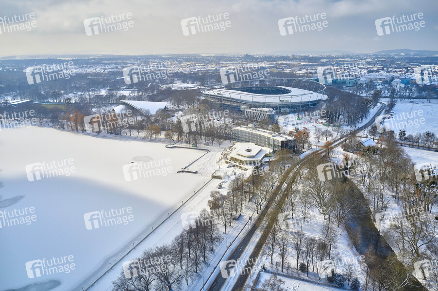Luftbild vom verschneiten Maschpark und dem Maschsee im Winter. (Der Drohnenflug wurde ordnungsgemäß bei der Polizei Leitstelle Hannover angemeldet) Hannover, 09.02.2021