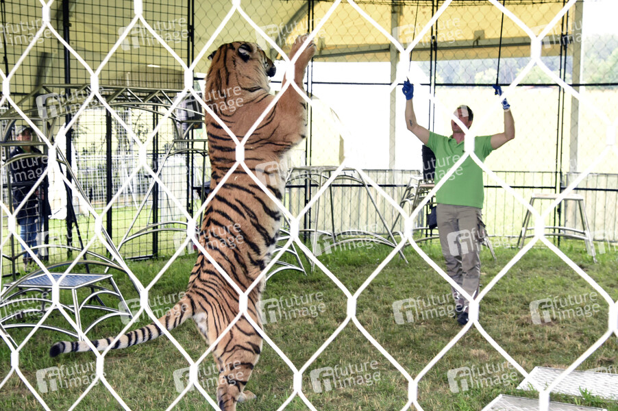 Alexander Lacey mit Tiger beim Presserundgang auf der Circus Krone-Farm. Weßling, 29.06.2020