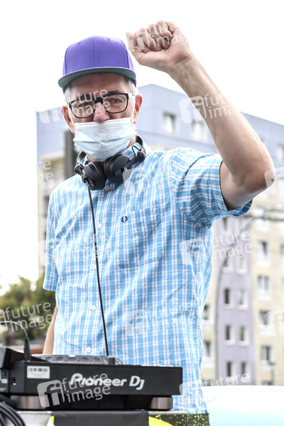 Dr. Motto (Gründer der Loveparade) und Vertreter der Veranstaltungbranche demonstrieren unter dem Motto 'Rettet die Veranstaltungsbranche' für eine Lockerung der Coronamaßnahmen, für finanzielle Unterstützung und die Unterstützung bei der Durchführung alternativer Veranstaltungskonzepte. Seit März sind die Musikklubs und Konzerthallen weitgehend geschlossen. Berlin, 14.08.2020