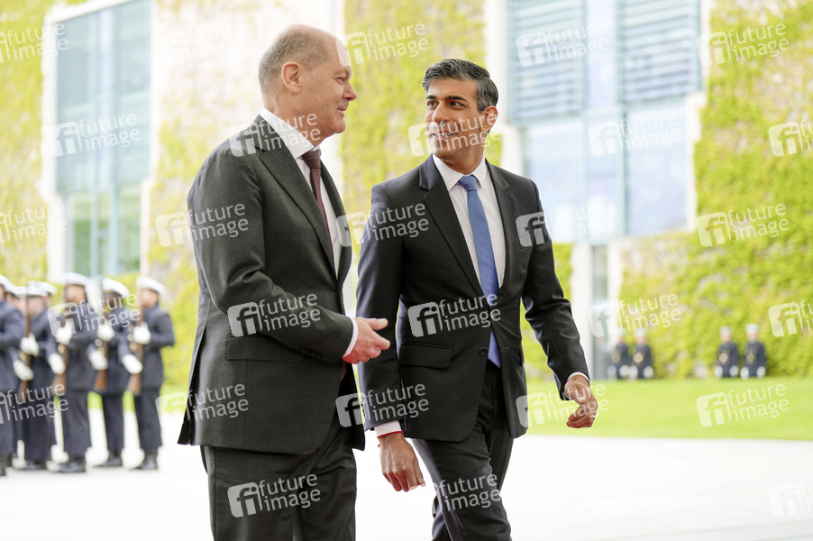 Olaf Scholz und Rishi Sunak beim Empfang des Premierministers des Vereinigten Königreichs von Großbritannien und Nordirland mit militärischen Ehren und zu einem gemeinsamen Gespräch mit dem Bundeskanzler mit anschließendem Pressestatement im Bundeskanzleramt. Berlin, 24.04.2024
