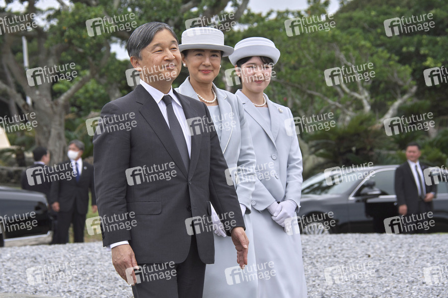 Kaiser Naruhito, Kaiserin Masako und Prinzessin Aiko beim Besuch des Nationalfriedhofs im Okinawa-Senseki-Quasi-Nationalpark um der Opfer der Schlacht um Okinawa im Zweiten Weltkrieg vor 80 Jahren zu gedenken. Itoman, 04.06.2025