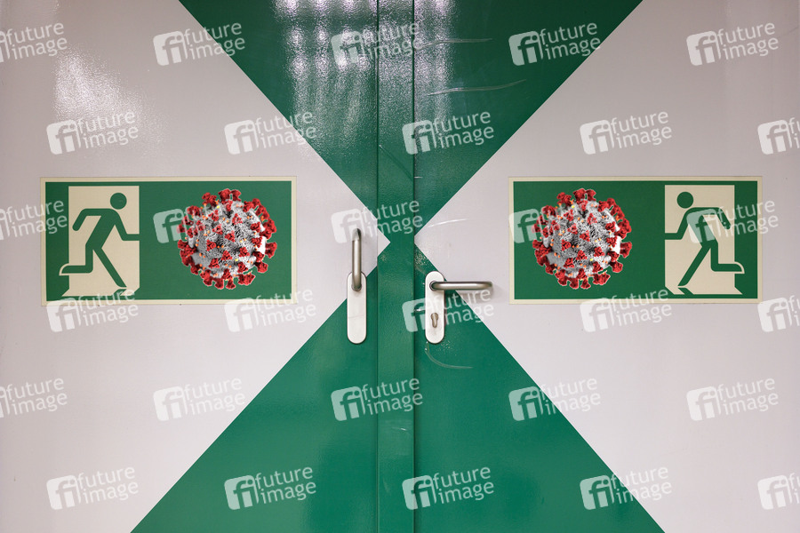 Ein Notausgang-Schild mit einer Grafik des Coronavirus des CDC symbolisiert das Ringen um eine Exit-Strategie der Bundesregierung aus der Coronakrise