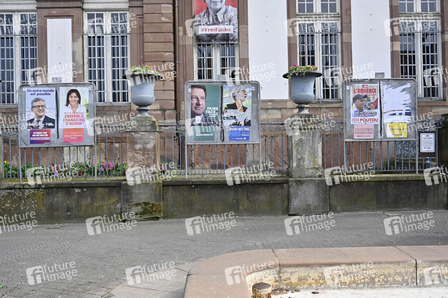 Wahlplakate - Die Präsidentschaftswahl in Frankreich 2022 ist die zwölfte Wahl des Staatspräsidenten der Fünften Französischen Republik. Der erste Wahlgang findet nach Ablauf der laufenden fünfjährigen Amtszeit am 10. April 2022 statt. Sollte kein Kandidat im ersten Wahlgang die absolute Mehrheit er Stimmen erhalten, ist am 24. April ein zweiter Wahlgang vorgesehen. Straßburg, 05.04.2022
