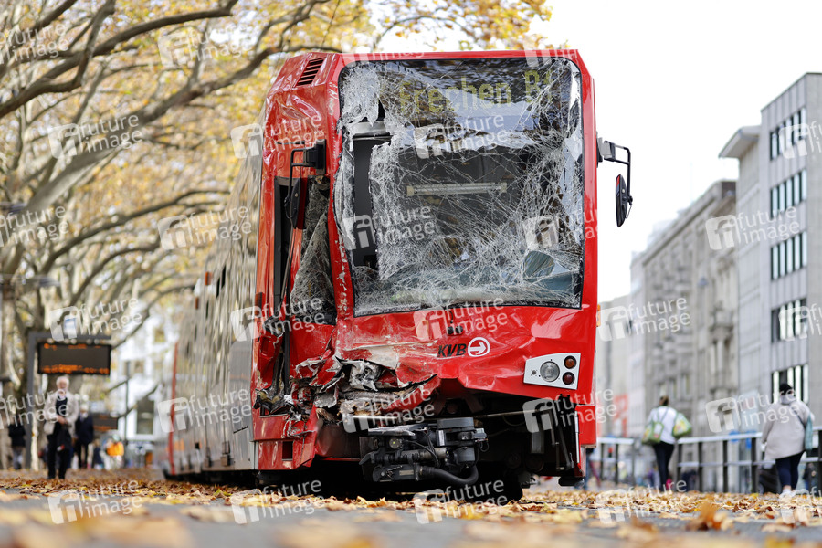 Bei einem schweren Straßenbahn-Unfall am Neumarkt zwischen zwei KVB-Zügen der Linien 1 und 7 sind 20 Menschen verletzt worden, eine Bahnfahrerin schwebt in Lebensgefahr. Als Ursache gilt derzeit eine fehlerhafte Weichenstellung. Köln, 02.11.2020