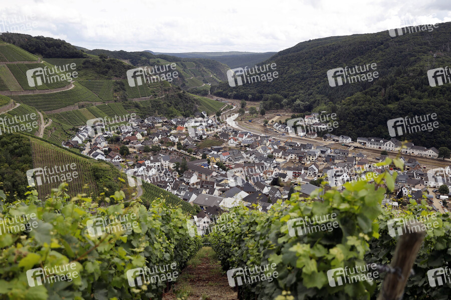 Nach dem Jahrhunderthochwasser in der Eifel durch heftige Regenfälle und Dauerregen mit Überschwemmungen und Überflutungen haben die Aufräumarbeiten im Ahrtal große Fortschritte gemacht. Einheiten von Polizei, THW, Bundeswehr und Feuerwehr mitsamt vielen freiwilligen Helfern haben Straßen geräumt, Schutt und Schlamm entfernt und die Menschen versorgt. Der Wiederaufbau wird trotzdem Jahre dauern. Im Bild Flutschäden in der Ortschaft Dernau, in der die Flut viele Häuser zerstörte, 08.08.2021