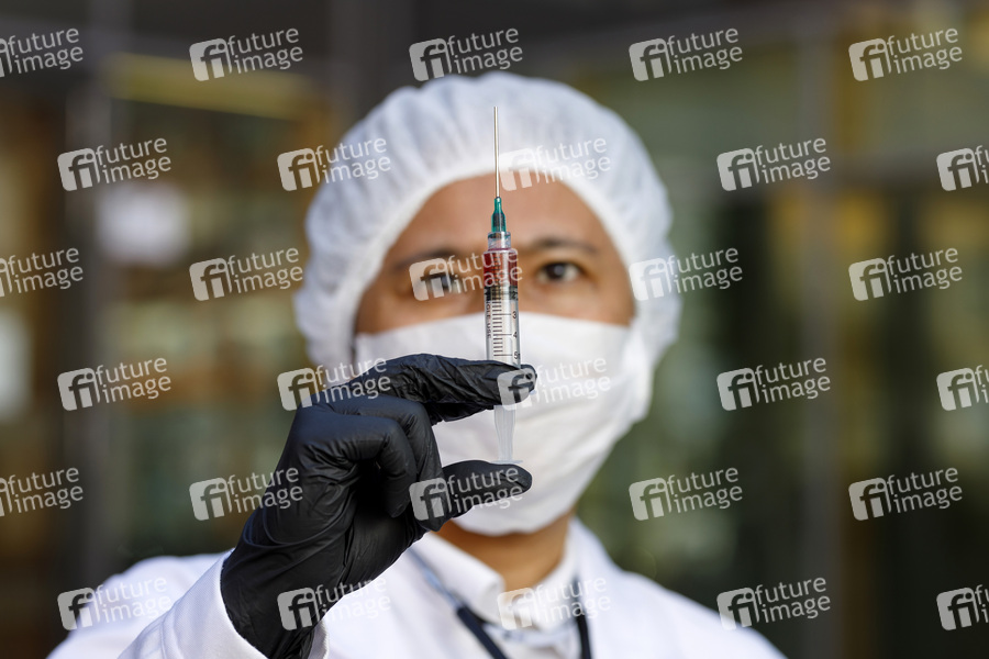 Eine Virologin posiert mit einer Spritze zur Impfung gegen das Corona-Virus. (Symbolfoto mit Model) Nürnberg, 23.04.2020