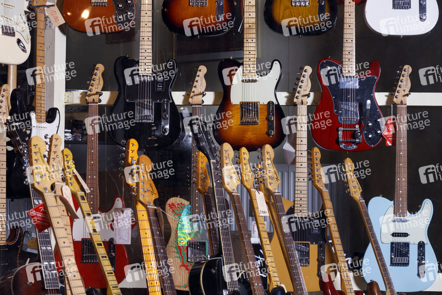 Gitarren in einem Fachgeschäft für Musikinstrumente. Köln, 28.03.2020