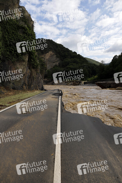 In der Eifel haben heftige Regenfälle und Dauerregen für Überschwemmungen und Überflutungen gesorgt. Im Ahrtal trat der Fluss vielerorts über die Ufer und überschwemmte nicht nur Keller sondern ganze Ortschaften. Im Bild die Straße zwischen Dernau und Walporzheim, die von den Fluten auf einem Abschnitt einfach mitgerissen wurde. Dernau, 15.07.2021