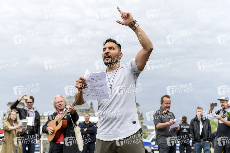 Vegan-Koch Attila Hildmann bei einer unangemeldeten Versammlung gegen die Einschränkung der Grundrechte durch die Corona-Eindämmungsverordnung vor dem Reichtagsgebäude in Berlin. An dem Protest beteiligten sich Verschwörungstheoretiker, Impfgegner aber auch rechte Gruppierungen und Hooligans. Berlin, 23.05.2020