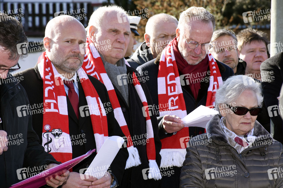 Christian Vorländer, Uli Hoeneß und Karl-Heinz Rummenigge bei der Grundsteinlegung für eine Gedenkvitrine zum 62. Jahrestag des Flugzeugunglücks am damaligen Flughafen München-Riem, bei dem 23 Menschen ums Leben kamen, darunter acht Fußballspieler von Manchester United, am Manchesterplatz. München, 06.02.2020