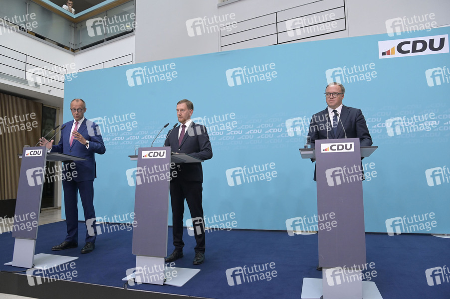 Friedrich Merz, Michael Kretschmer und Mario Voigt bei der Pressekonferenz der CDU nach den Landtagswahlen in Thüringen und Sachsen im Konrad-Adenauer-Haus. Berlin, 02.09.2024