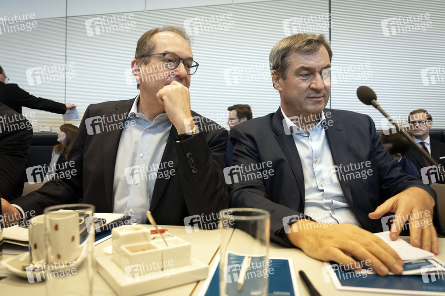 Alexander Dobrindt und Markus Söder bei der konstituierenden Fraktionssitzung mit Unterzeichnung des Vertrags über die Fortführung der Fraktionsgemeinschaft von CDU und CSU im Reichstagsgebäude. Berlin, 25.02.2025