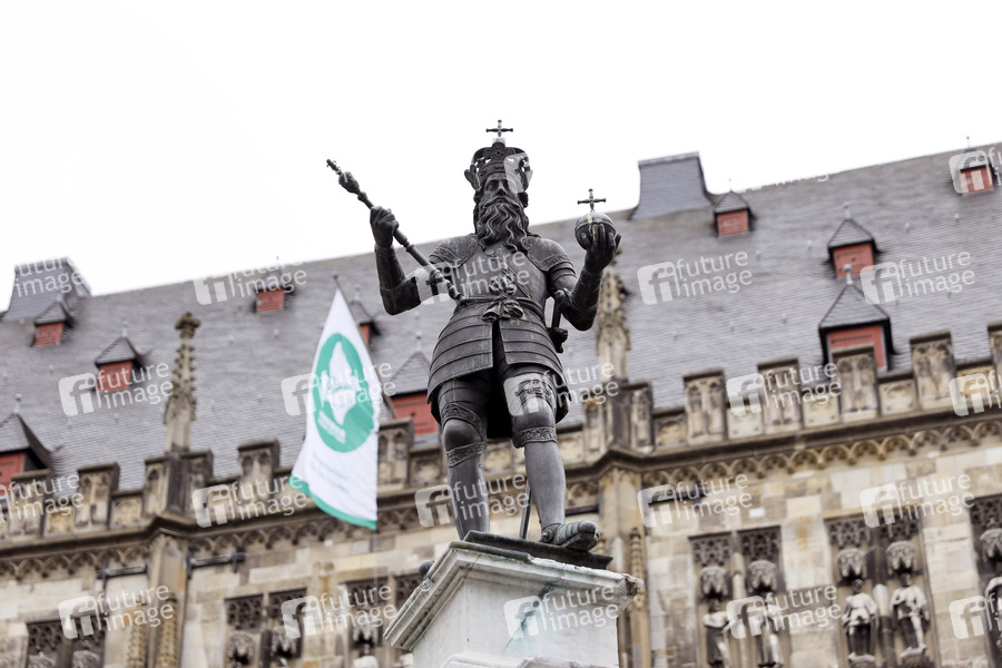Der Karlsbrunnen, auch Marktbrunnen, befindet sich auf dem Markt in Aachen direkt vor dem gotischen Aachener Rathaus und ist der älteste Brunnen der Stadt. Seit 1620 krönt ihn eine Statue Karls des Großen. (Themenbild, Symbolbild) Aachen, 09.07.2021