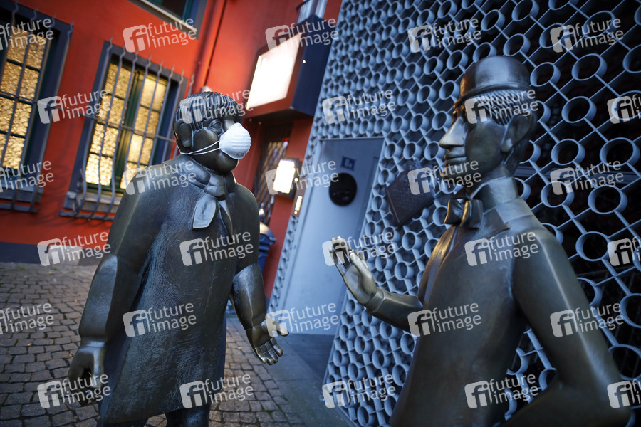 Die Figuren von Tünnes und Schäl in der Altstadt tragen Mundschutz während der Corona-Krise. Köln, 20.03.2020